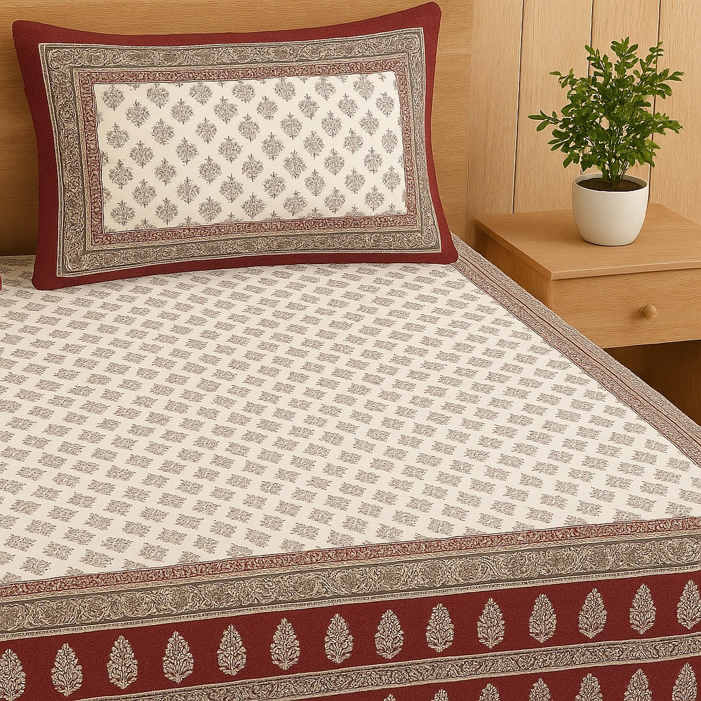 Give your bedroom a classy and refreshing makeover with this cotton printed double bed sheet set, designed in a white base with maroon borders and intricate grey floral motifs. Crafted from premium quality cotton fabric, this bed sheet ensures softness, durability, and breathability, making it perfect for everyday use and long-lasting comfort.