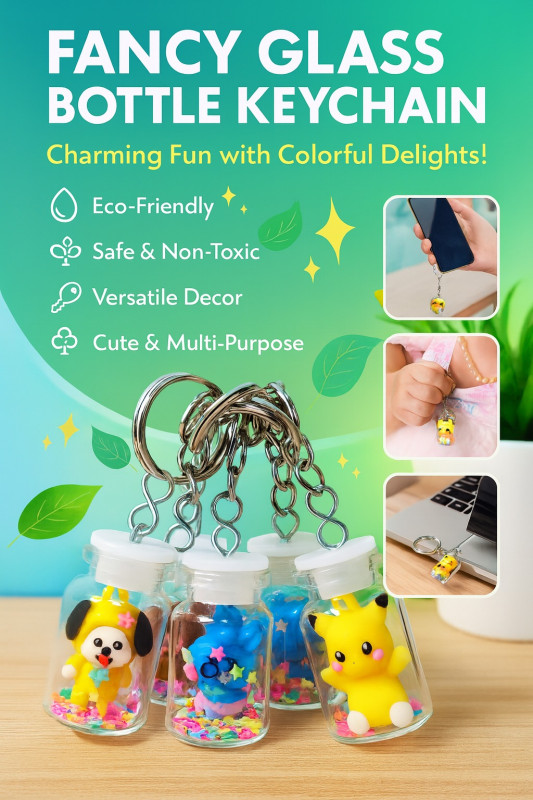 Add a touch of charm and fun to your everyday essentials with this Fancy Glass Bottle Keychain. Each mini glass bottle contains a colorful and cute figurine (like Pikachu, puppy, or bear) surrounded by vibrant confetti, making it a perfect accessory for bags, keys, or even as desk décor.
