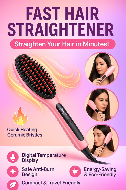 Straighten your hair quickly and safely with the Fast Hair Straightener Brush. Featuring quick heating ceramic bristles, a digital temperature display, and a safe anti-burn design, this compact and travel-friendly brush delivers salon-style smoothness in just minutes.