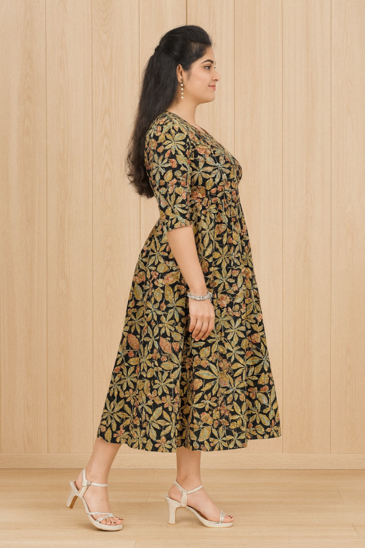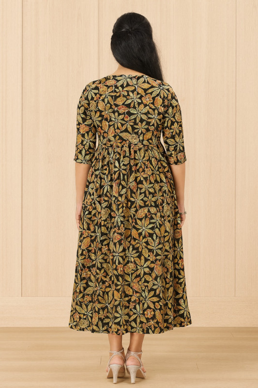This chic and elegant floral print dress combines the timeless beauty of nature with a contemporary twist. Crafted from breathable fabric, this dress features a flattering silhouette with a soft empire waist. The rich black backdrop is adorned with vibrant floral patterns in gold, red, and green, perfect for any casual outing or evening gathering. Its 3/4 sleeves provide extra comfort, and the flowy design allows freedom of movement, making it an ideal pick for every season.