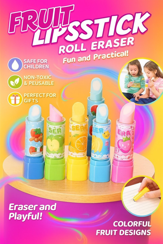 Add a playful twist to your stationery collection with these Fruit Lipstick Roll Erasers! Designed to look like lipstick tubes, each eraser features bright fruit-themed wrappers (Strawberry, Orange, Apple, Banana, Cherry, and more). The twist-up design makes them easy to use, clean, and fun for kids.