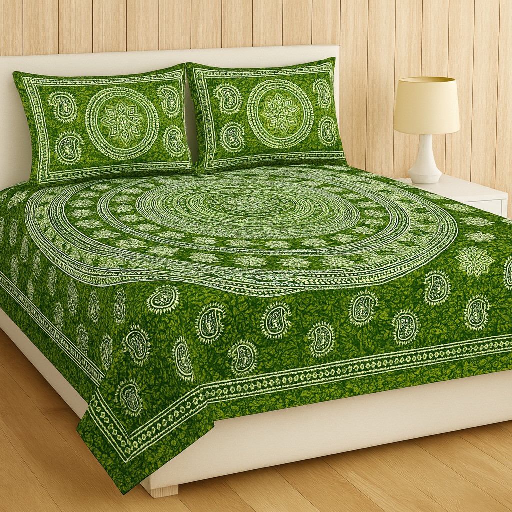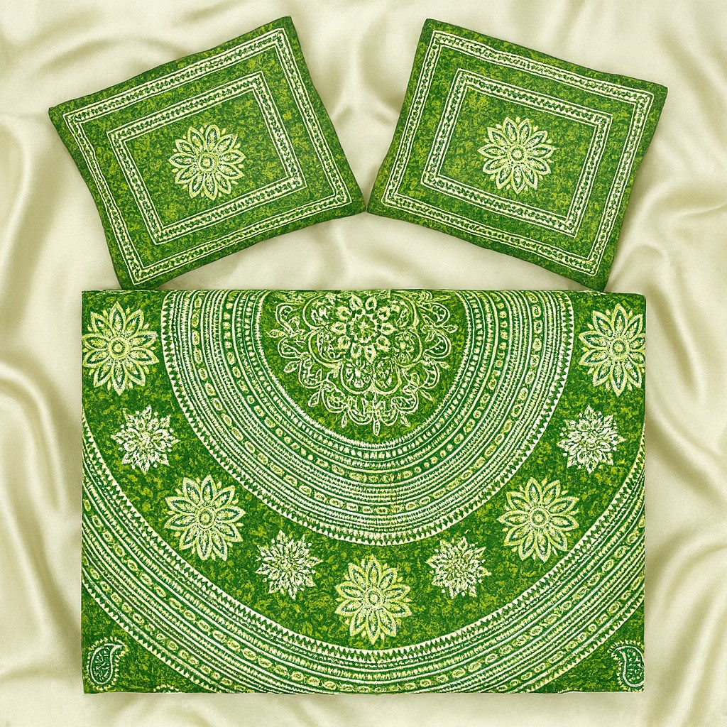 Give your bedroom a refreshing makeover with this elegant green mandala print cotton bedsheet set. Featuring intricate circular mandala patterns and ethnic motifs, this bedsheet blends traditional charm with modern elegance. Crafted from soft, breathable cotton fabric, it ensures maximum comfort and durability. The coordinated pillow covers with matching designs complete the set, making it a perfect choice for daily use, festive décor, or gifting.