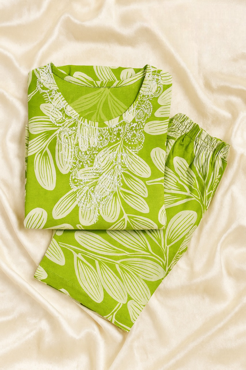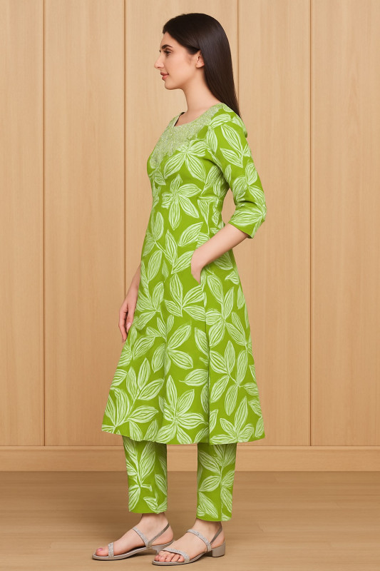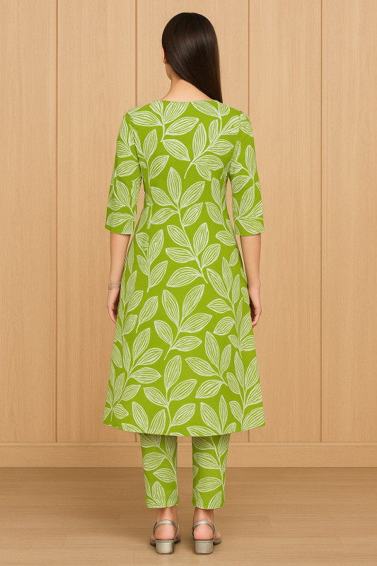 Elevate your everyday style with this Green Leaf Print A-Line Kurta Set. Featuring a fresh leafy pattern in light green on a vibrant green base, this outfit exudes a chic and refreshing vibe. The kurta comes with three-quarter sleeves, a round neck with delicate embroidery detail, and a flattering A-line cut that ensures both elegance and comfort. Paired with matching straight-fit pants, this set is crafted from breathable fabric, making it an ideal choice for daily wear, office wear, festive occasions, and casual outings.