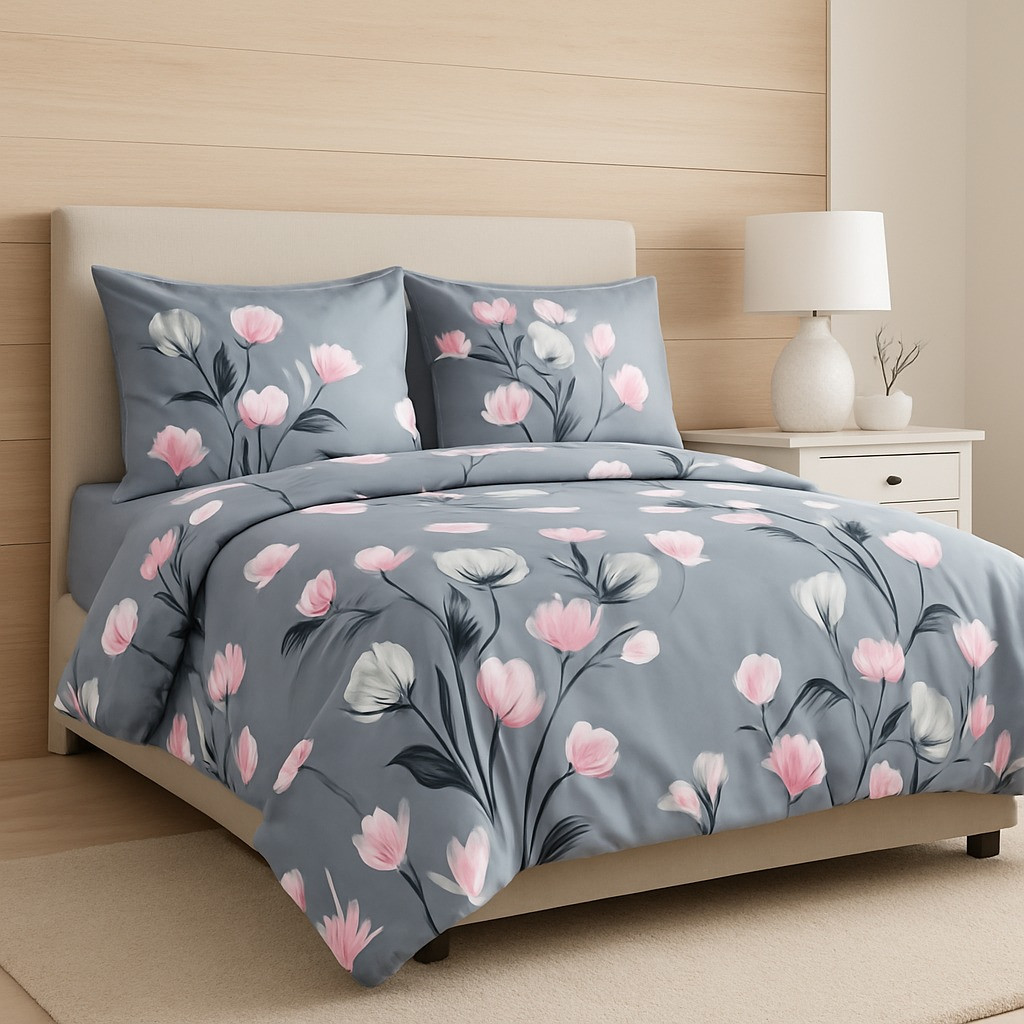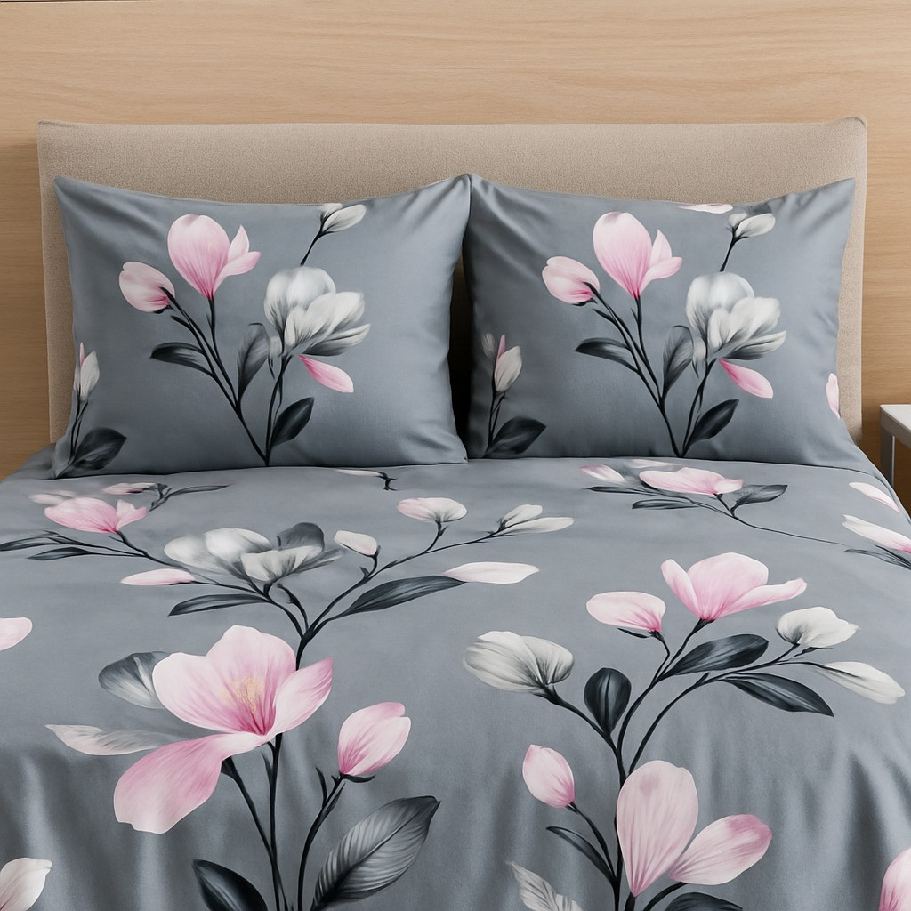 Bring a touch of elegance and softness to your bedroom with this grey floral cotton double bedsheet set. Designed with delicate pink and white blossoms on a muted grey base, this bedsheet exudes a calm, modern, and sophisticated vibe. Crafted from premium quality cotton fabric, it ensures comfort, breathability, and durability. The matching pillow covers with the same floral design complete the coordinated look, making your bed the highlight of your room décor.