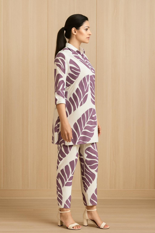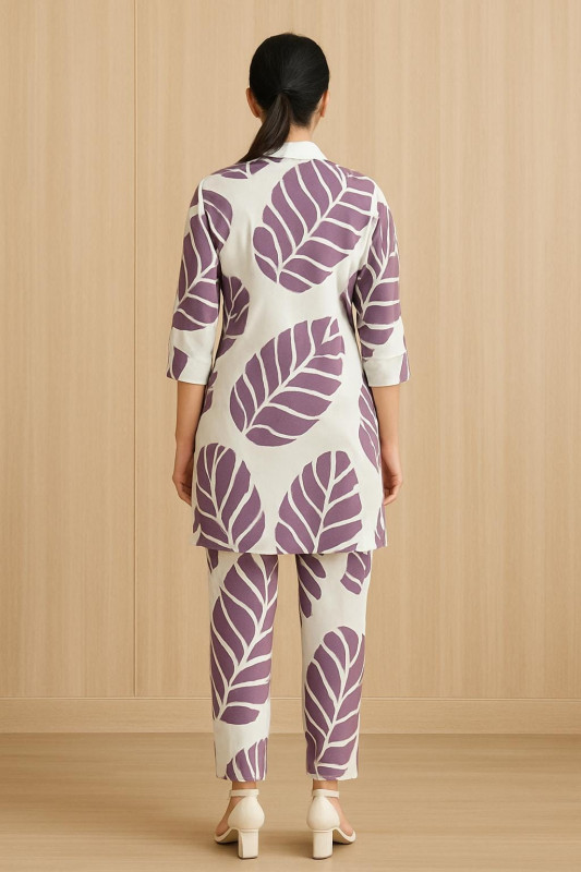 Add a touch of elegance to your wardrobe with this stylish cotton kurti set. Designed with a classic collared neckline, 3/4th sleeves, and a straight-fit silhouette, this kurti brings together both comfort and sophistication. The ivory base is beautifully adorned with bold leaf print patterns in deep purple, giving it a modern yet ethnic vibe.