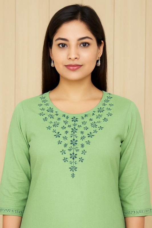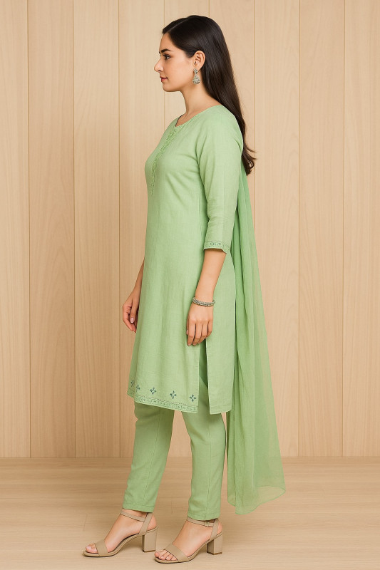 Refresh your ethnic collection with this beautiful light green kurta set, crafted from soft and breathable cotton fabric. Featuring delicate blue thread embroidery on the neckline and scattered motifs, this kurta offers a graceful and minimalistic look. The straight-fit design with 3/4th sleeves makes it both comfortable and stylish for everyday wear. Paired with matching pants featuring embroidered hem and a light green dupatta, this set is a perfect blend of elegance and comfort.