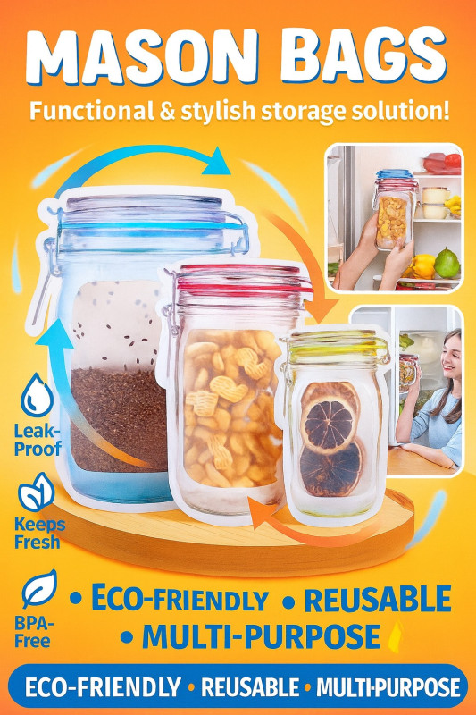 Made from eco-friendly, BPA-free materials, these bags are leak-proof, airtight, and reusable, making them an ideal choice for snacks, coffee, dry fruits, candies, and even travel essentials. Their compact and lightweight design makes them easy to store and carry, while the transparent jar-print design helps you easily identify contents.