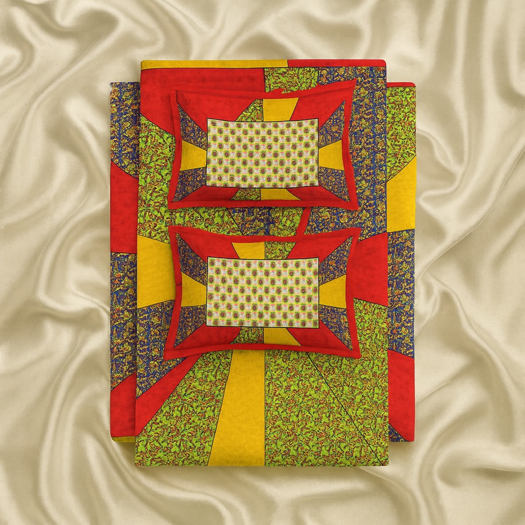Brighten up your bedroom with this vibrant multicolor patchwork cotton double bedsheet set. Featuring bold shades of red, yellow, green, and blue with intricate patterns, this bedsheet brings a festive and lively charm to your room décor. The central floral block print contrasts beautifully with the colorful patchwork borders, giving it a unique and eye-catching appeal. Made from soft and breathable cotton, it ensures maximum comfort and durability. The matching pillow covers complete the coordinated look, making your bed the highlight of your space.