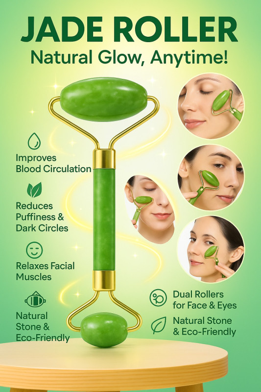 Achieve a natural glow and relaxed skin with this 100% Natural Jade Roller. Designed with dual rollers for the face and eyes, it helps improve blood circulation, reduce puffiness, and minimize dark circles. A must-have skincare tool for your daily beauty routine!