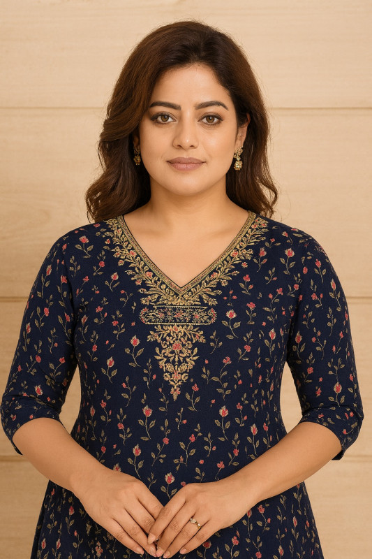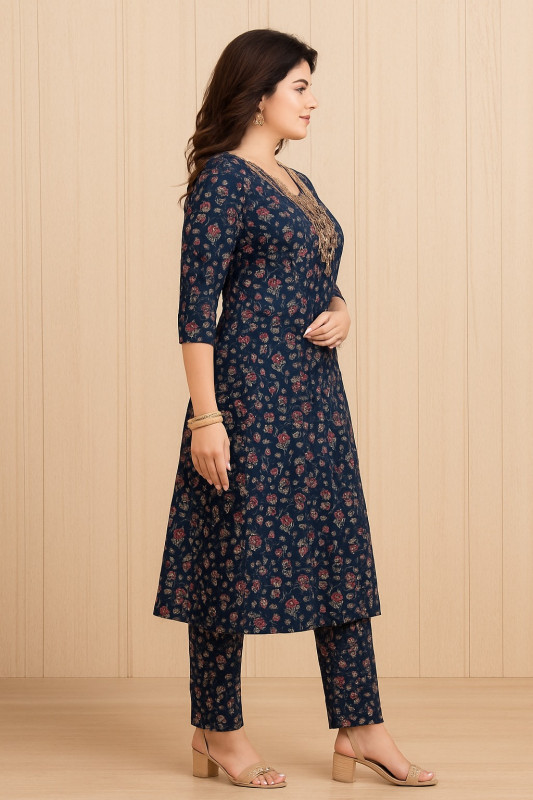 This stunning navy blue A-line dress features intricate floral patterns and elegant golden embroidery on the neckline, adding a touch of traditional charm. With a flattering empire waist and 3/4 sleeves, it provides a comfortable yet stylish fit for various occasions. The matching pants complete the set, offering a seamless, coordinated look. Made from soft, breathable fabric, this dress ensures comfort while exuding effortless style, making it ideal for festive occasions, casual gatherings, or family events.