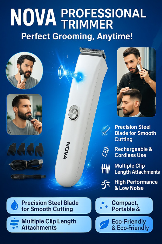 Achieve salon-style grooming at home with the Nova Professional Trimmer. Equipped with a precision steel blade for smooth cutting, multiple clip length attachments, and a rechargeable cordless design, this trimmer ensures perfect grooming anytime, anywhere. Compact, portable, and eco-friendly – ideal for men’s daily grooming needs.