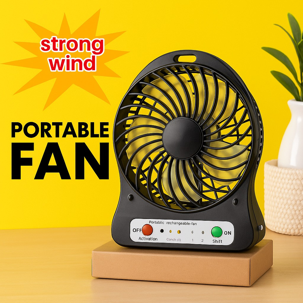 Stay cool anywhere with this Rechargeable Portable Fan, designed for strong airflow and easy portability. With a compact design, multiple speed settings, and rechargeable battery, it’s perfect for home, office, travel, or outdoor use.