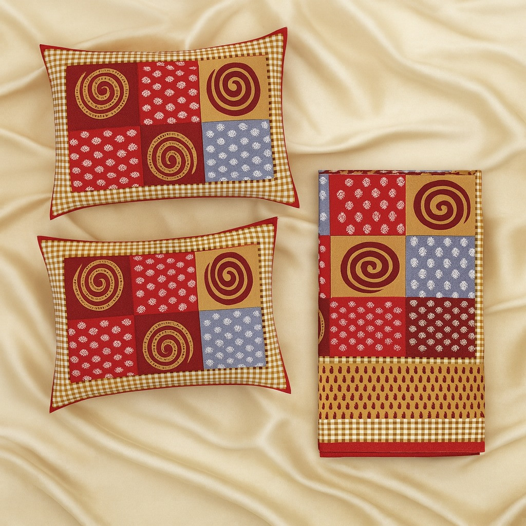 Add a vibrant touch to your bedroom with this red and blue geometric print cotton bedsheet set. Designed with a unique checkered pattern featuring spirals, dots, and bold color contrasts, this bedsheet brings a modern and artistic vibe to your space. Crafted from soft, breathable cotton fabric, it ensures lasting comfort and durability. The coordinated pillow covers with matching geometric prints enhance the overall look, making your bed stylish and eye-catching.