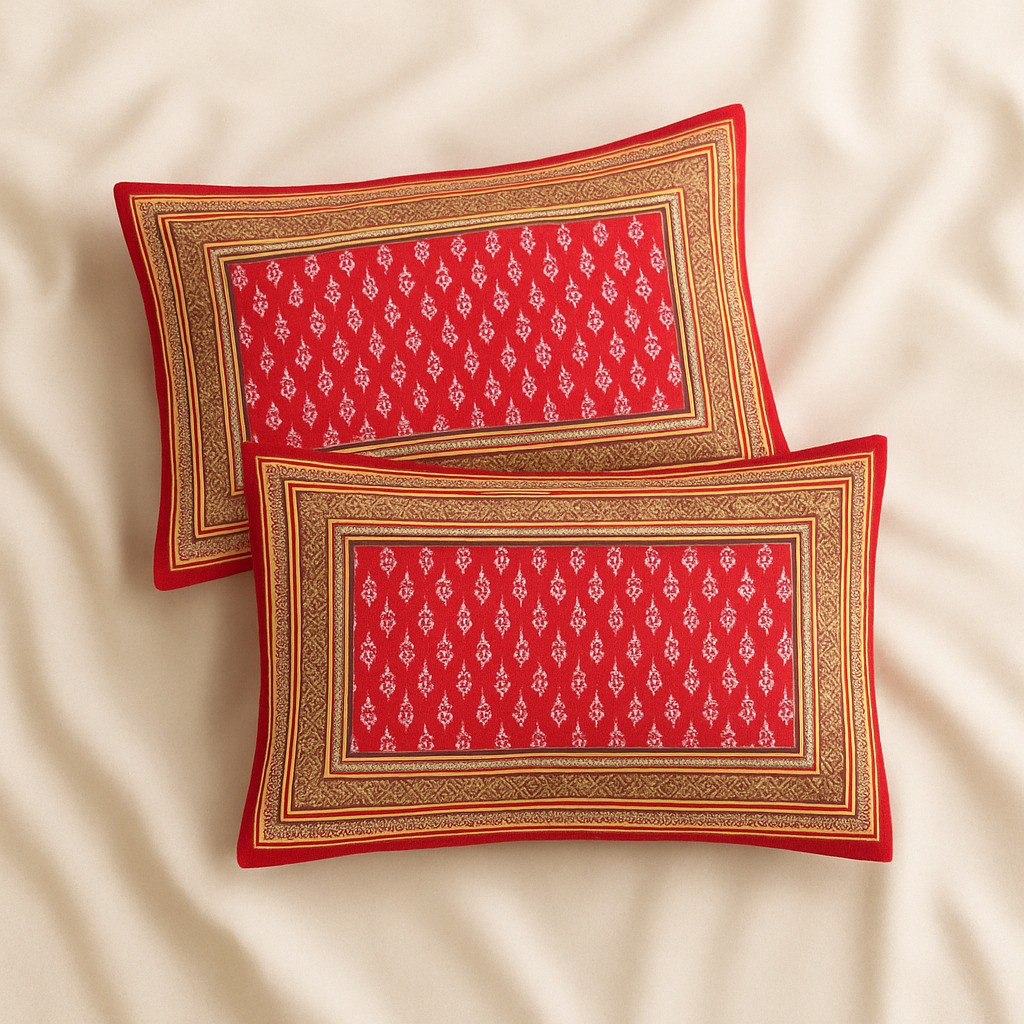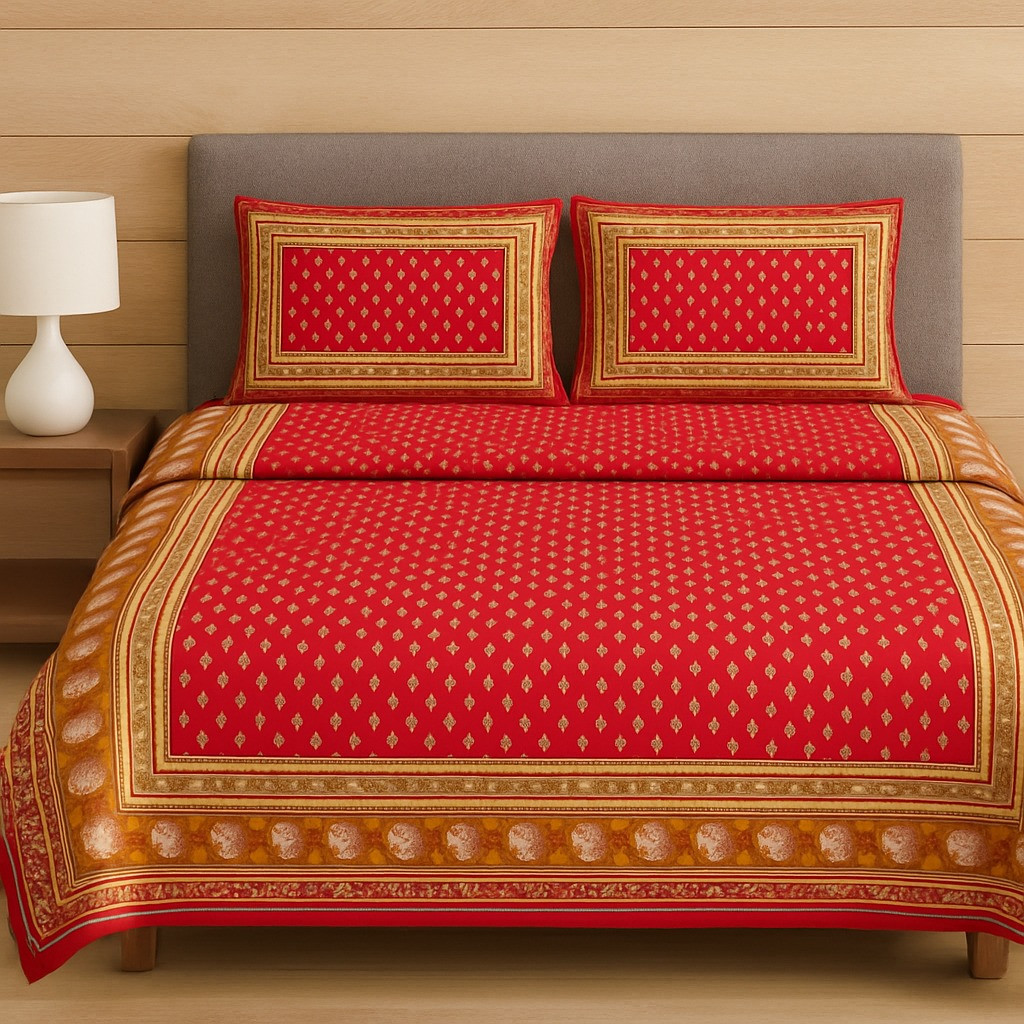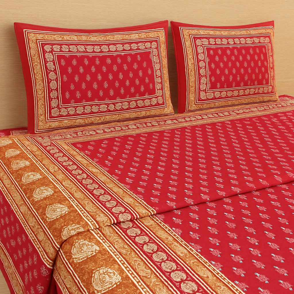 Red & Golden Border Cotton Double Bed Sheet with Pillow Covers