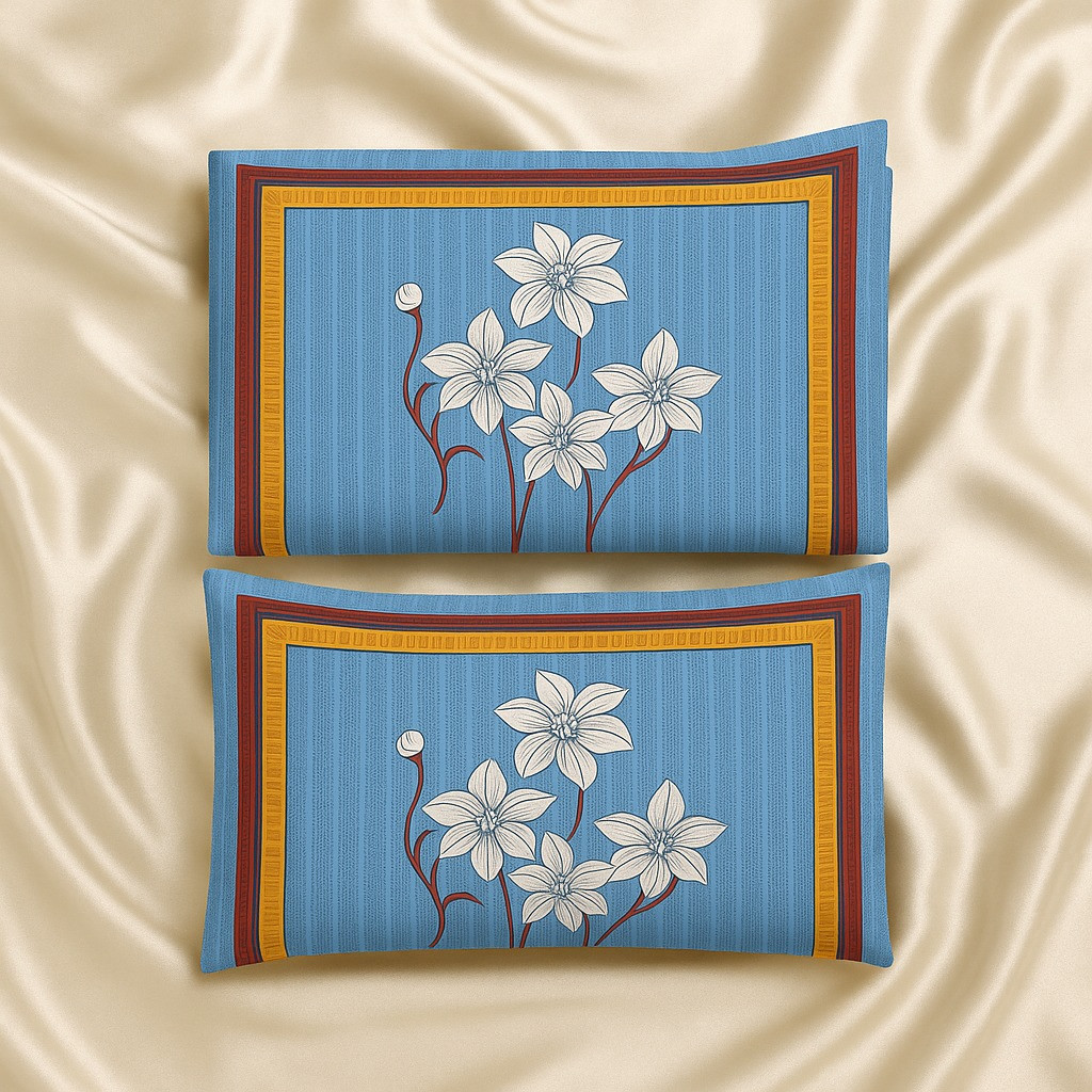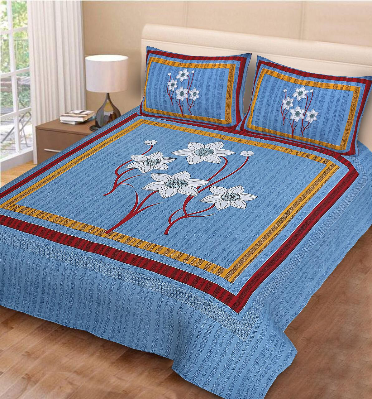 Add a refreshing touch of elegance to your bedroom with this sky blue floral cotton bedsheet set. Designed with a modern striped background and large white flower motifs framed with red and yellow borders, this bedsheet brings a perfect balance of simplicity and vibrancy to your home décor. Made from soft and breathable cotton fabric, it ensures comfort and durability for everyday use. The matching pillow covers with the same floral design complete the coordinated look, making your bed stylish and inviting.