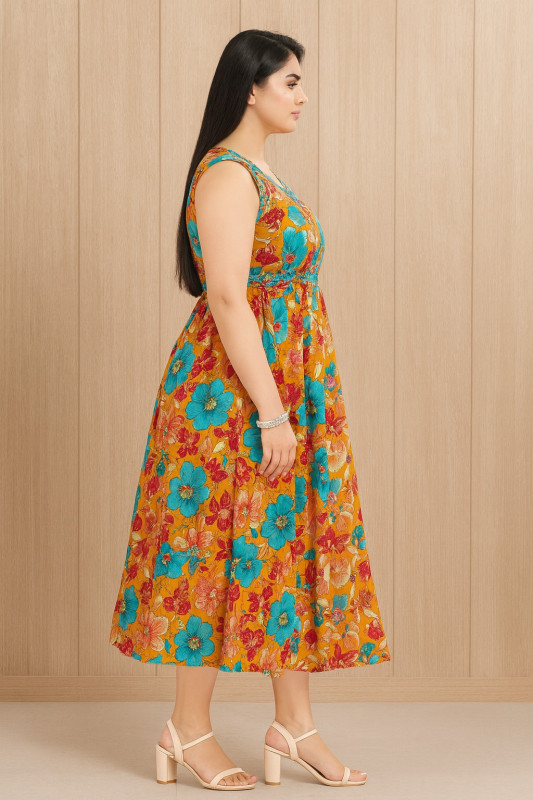 Step into effortless elegance with this Sleeveless Multicolor Floral A-Line Dress. Designed with vibrant shades of red, blue, and orange floral prints on a mustard-yellow base, this dress is perfect for summer and spring. The sleeveless design with a round neckline adds a modern charm, while the cinched waist with delicate lace detailing enhances the feminine silhouette. Crafted from lightweight, breathable fabric, it ensures maximum comfort for all-day wear. This ankle-length A-line dress is perfect for casual outings, brunches, vacations, and festive gatherings.