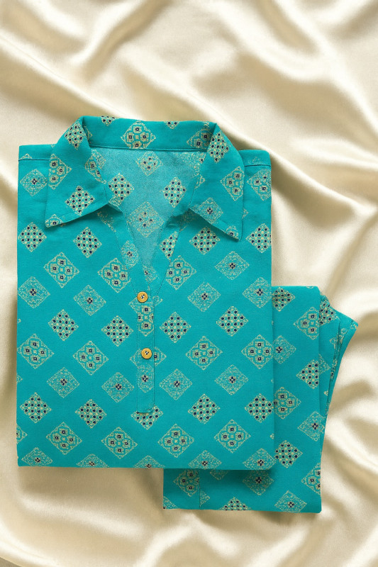 Elevate your everyday style with this elegant teal blue cotton kurta set. Designed with a classic collared neckline and three-quarter sleeves, this kurta features a subtle all-over geometric print that blends tradition with modern charm. The straight-fit pants in a matching print complete the coordinated look, making it perfect for both casual outings and office wear. Crafted from breathable cotton fabric, this outfit ensures all-day comfort without compromising on style.