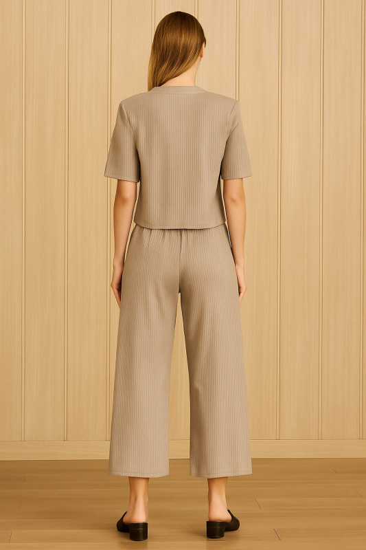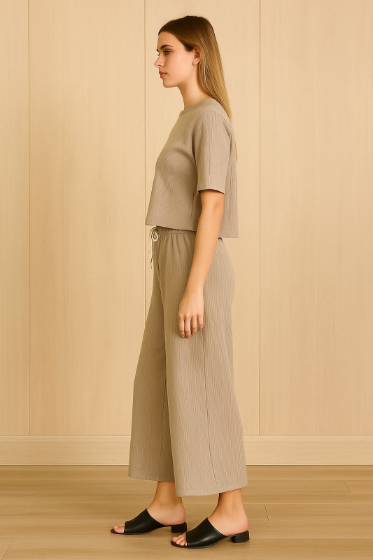 Stay trendy and comfortable with this beige co-ord set, designed for modern casual fashion. The set includes a short-sleeved crop top and wide-leg trousers, both crafted from soft, textured fabric that ensures breathability and ease of movement.