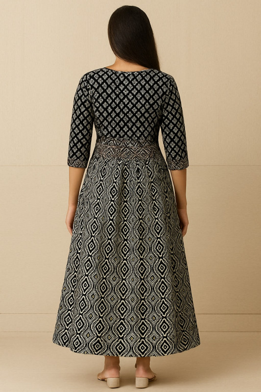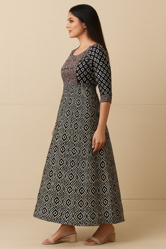 Make a bold and elegant statement with this black and beige printed Anarkali kurta, crafted with intricate geometric motifs for a sophisticated ethnic look. The kurta features a round neckline, 3/4th sleeves, and a beautifully detailed contrasting yoke design with tribal-inspired patterns in earthy tones.