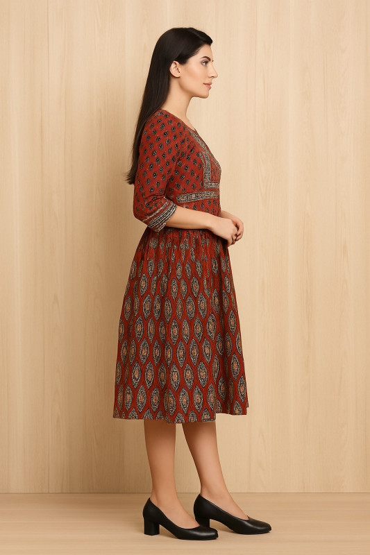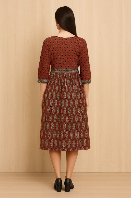 The front yoke is detailed with intricate block-style prints, while the sleeves and tiered layers are highlighted with complementary ethnic motifs. Its earthy tones of brown, black, and beige make it versatile for festive occasions, casual outings, or office wear.