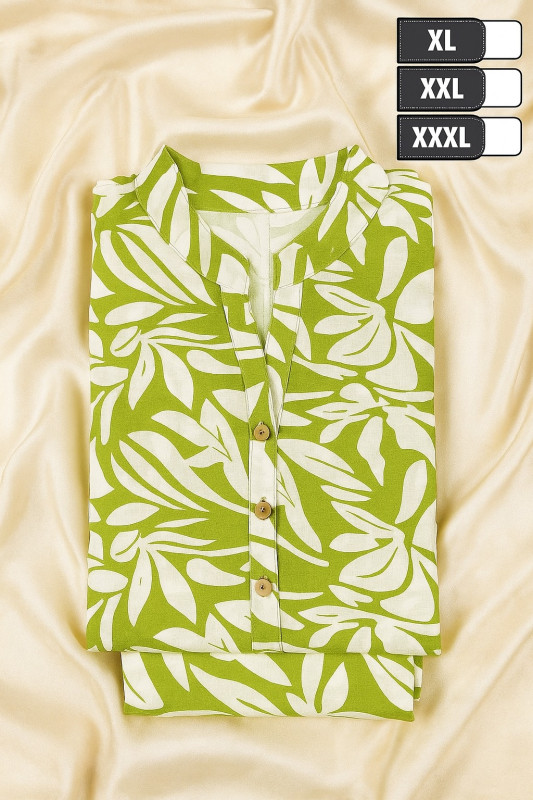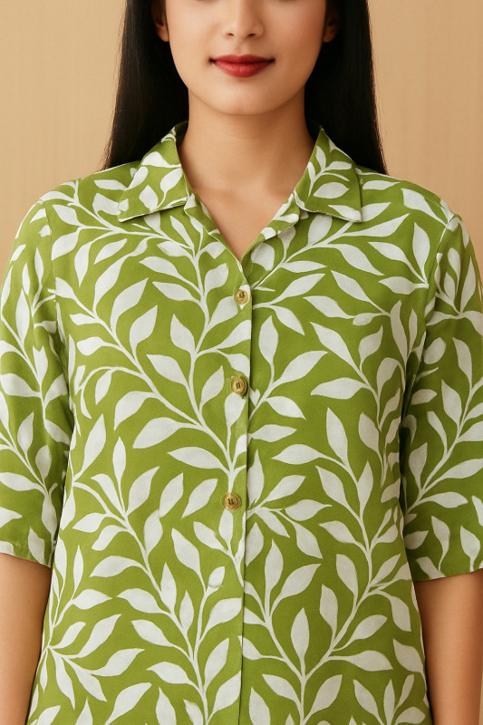 The highlight of this set is the all-over white leaf print on a vibrant green base, creating a refreshing and nature-inspired design. The matching straight-fit pants complete the coordinated look, making it perfect for office wear, casual outings, or daily comfort wear.