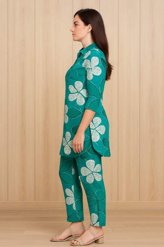 Step into comfort and style with this elegant green printed kurta set, perfect for casual wear, office wear, and daily outings. Crafted from soft, breathable cotton fabric, this outfit ensures all-day comfort while keeping you fashionable. The kurta features a classic shirt collar, 3/4th sleeves, and side slits for easy movement. Paired with matching straight-fit pants, the set is designed with large floral prints in contrasting shades, making it eye-catching and trendy.