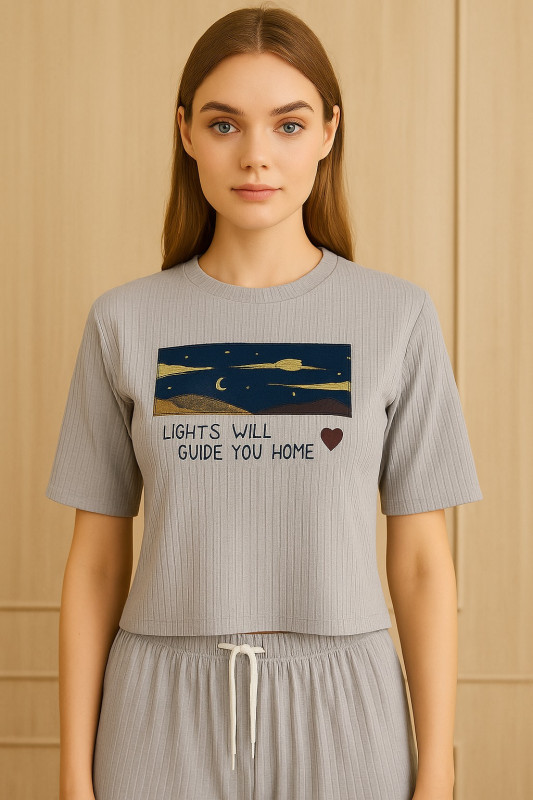 Stay effortlessly stylish and comfortable with this women’s grey co-ord set, perfect for both casual outings and lounging in style. The set includes a trendy half-sleeve printed T-shirt with a round neckline, featuring a chic abstract graphic with the quote “Lights Will Guide You Home”. Paired with elastic waist wide-leg pants and an adjustable drawstring for a relaxed yet secure fit, this outfit offers a perfect balance of fashion and ease.