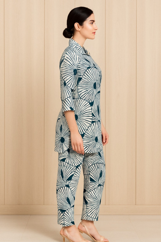 It features a shirt-style collar neckline with button-down detailing, 3/4th sleeves, and a straight-fit silhouette that gives a sleek and polished look. The overall design showcases large teal floral-inspired abstract prints on a subtle grey base, making it both eye-catching and versatile for casual outings, office wear, and daily styling.