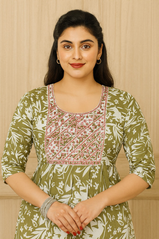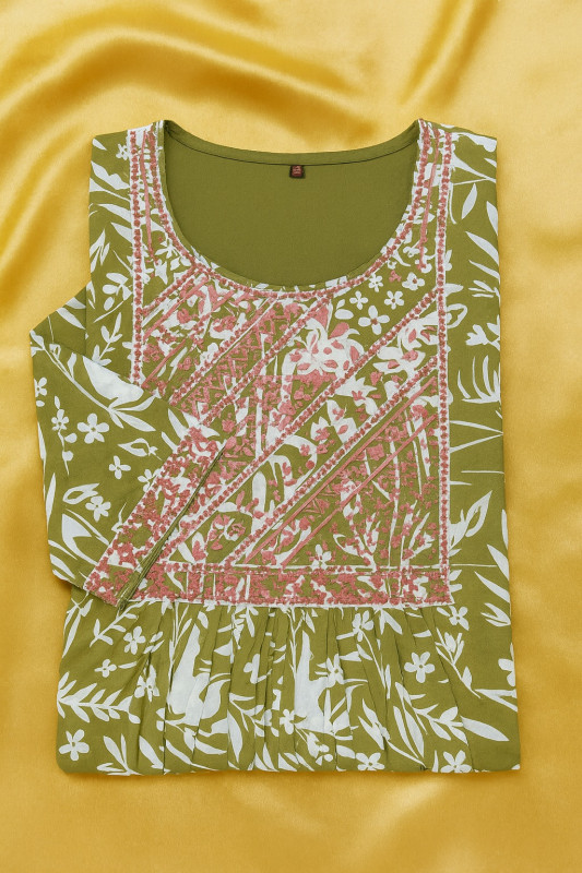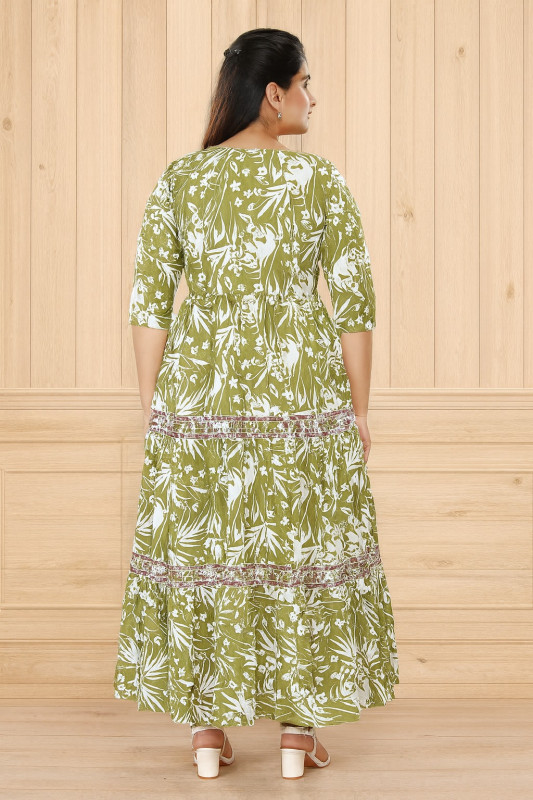 Add charm to your ethnic collection with this olive green tiered Long Grown dress, designed with beautiful floral and leafy prints. Crafted from lightweight, breathable fabric, this kurta ensures all-day comfort while giving a stylish ethnic look.