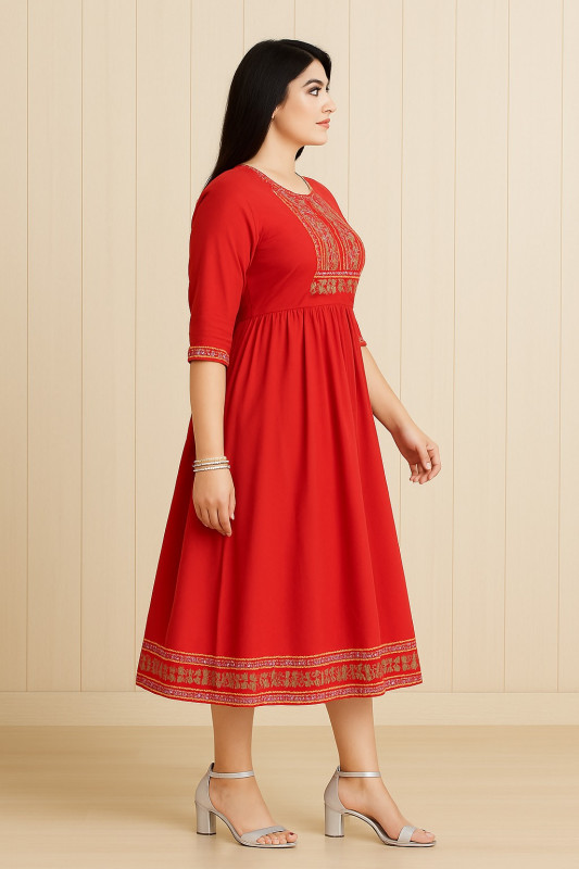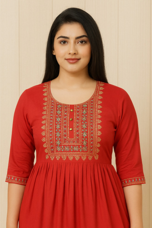 Add timeless elegance to your ethnic collection with this red embroidered Anarkali kurta dress, designed for festive occasions and everyday sophistication. Crafted from soft, breathable fabric, this kurta ensures comfort along with a graceful flow.