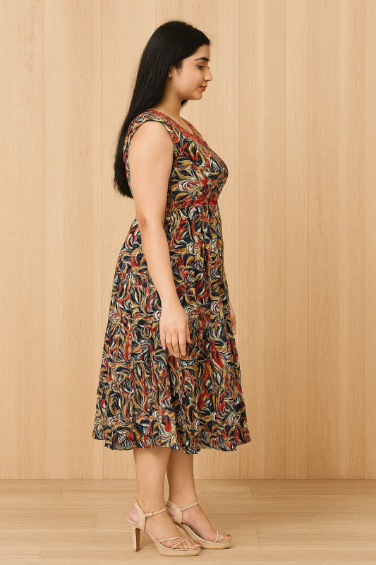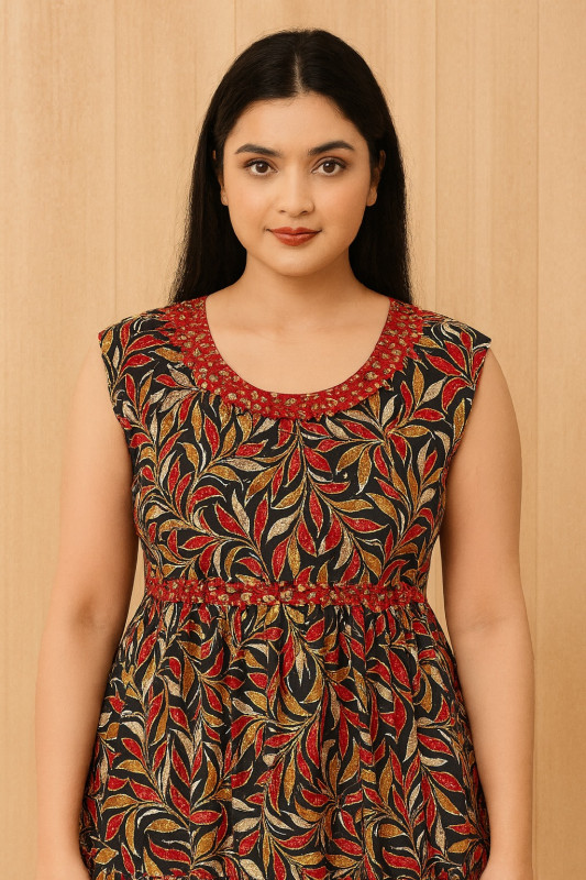 Step into elegance with this Sleeveless Black and Red Leaf Print Midi Dress. The beautiful blend of black, red, and golden leaf prints gives a rich, nature-inspired look that’s perfect for any casual outing or get-together. Featuring a flattering gathered waist and a rounded neckline with intricate embroidery, this dress exudes both comfort and style. The versatile color combination ensures that it pairs well with any accessory, making it a great choice for day-to-night wear.