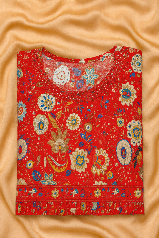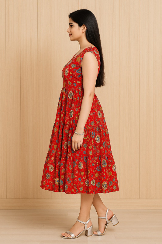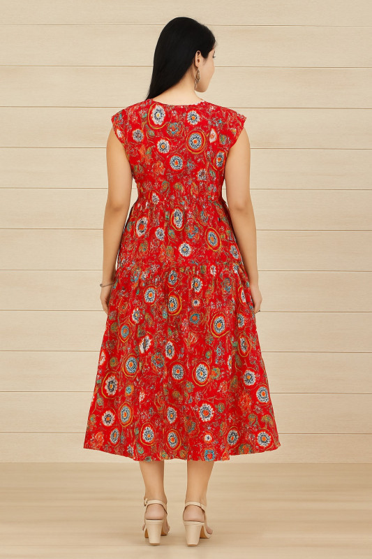 Add a touch of vibrant floral elegance to your wardrobe with this Sleeveless Red Floral Print Midi Dress. The lively red base adorned with intricate floral patterns in blues and yellows adds a pop of color and vibrancy to your style. This dress features a flattering fit-and-flare design, perfect for a comfortable yet chic look. Ideal for casual outings, summer picnics, or a day at the beach, this dress pairs effortlessly with sandals and a wide-brimmed hat.