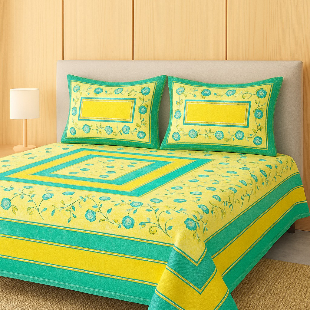 Brighten up your bedroom with this cheerful yellow and aqua blue floral cotton bedsheet set. Designed with a beautiful floral print and geometric border pattern, this bedsheet adds a vibrant and refreshing charm to your home décor. Crafted from soft and breathable cotton fabric, it ensures superior comfort and a cozy sleeping experience. The set comes with two matching pillow covers that perfectly complement the overall design, making your bed look stylish and inviting.