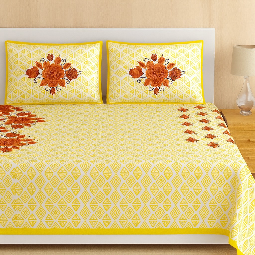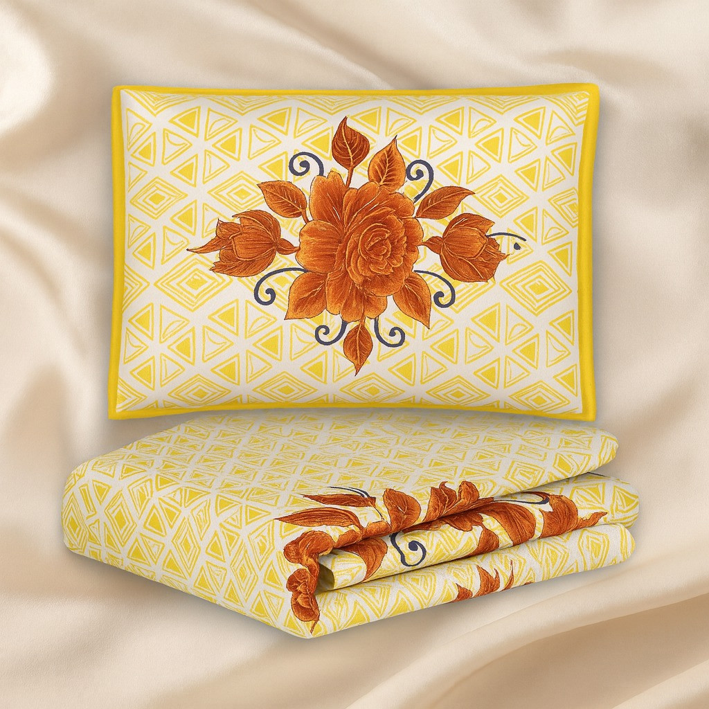 Brighten up your bedroom with this vibrant yellow floral cotton double bedsheet set. Featuring a geometric diamond background with bold red-orange floral prints, this bedsheet adds a cheerful and lively charm to your home décor. Crafted from soft, breathable cotton, it ensures maximum comfort and long-lasting durability. The set comes with two matching pillow covers showcasing striking floral motifs, completing the coordinated and stylish look.